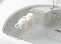 調理中の水切りにも便利な浅型の水切り網カゴ。シンクの中にピッタリ収まる専用設計。洗い物の水切りに便利です。